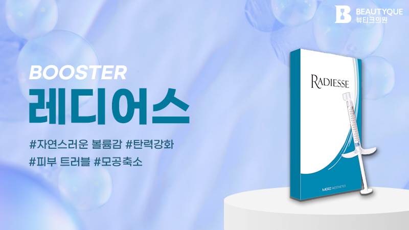 레디어스는 울쎄라, 제오민, 벨로텔로로 대표되는 독일 멀츠사의 칼슘부스터로, 2006년 콜라겐 생성 효과로 FDA 승인 받은 이후 전 세계적 80여개 국가에서 안전하게 시술되고 있는 제품입니다. 스킨 리페어 레디어스를 희석하여 주입하는 스킨 리페어 시술로 주목받고 있으며, 레디어스의 주성분인 칼슘 하이드록시아파타이트는 섬유아세포 활동을 활성화시켜, 신생 콜라겐 생성을 유도합니다. 이로 인해 피부 내 건강한 구조가 유지되고 엘라스틴 생성을 자극시켜, 피부 내에 견고한 구조를 생성해 전체적인 피부의 상태를 더 건강하게 만들어 줄 수 있는 장점이 있습니다.